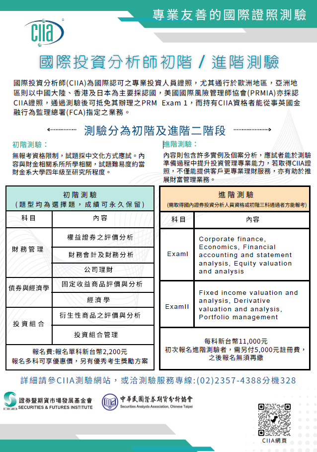 財團法人中華民國證券暨期貨市場發展基金會國際投資分析師CIIA測驗