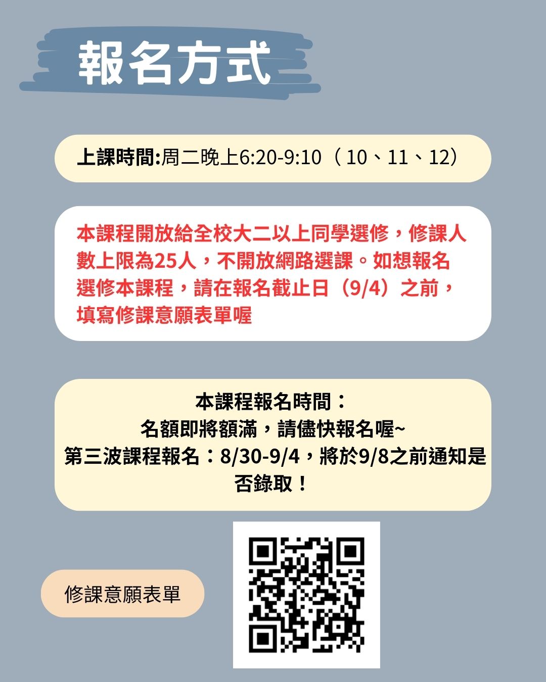 本課程開放給全校大二以上同學選修,修課人數上限為25人,不開放網路選課。如想報名選修本課程,請在報名截止日(8/29)之前,填寫修課意願表單喔(連結如下)