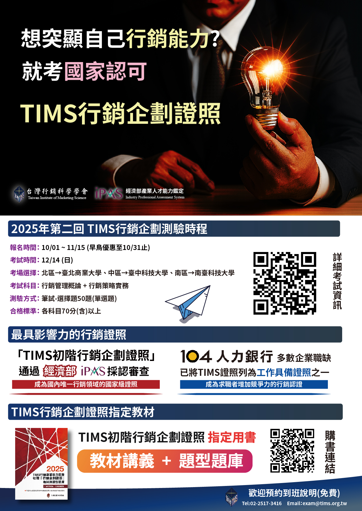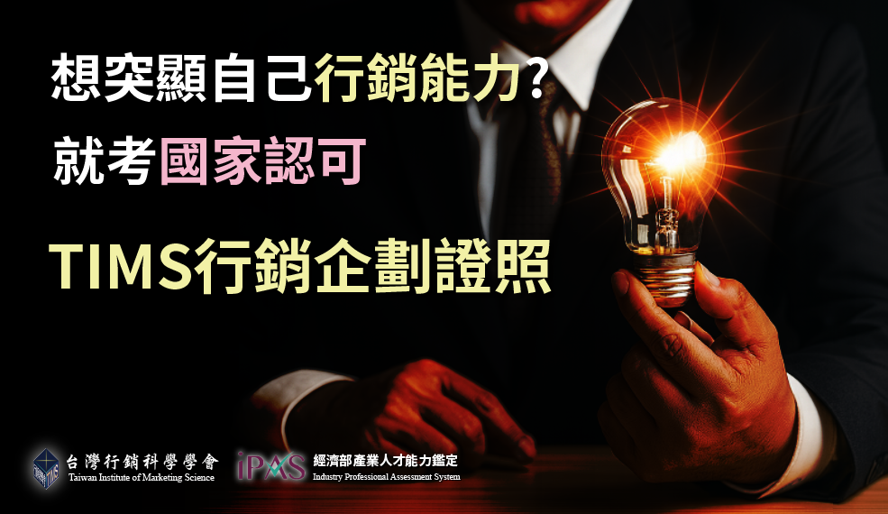台灣行銷科學學會即將於2025年12月14日辦理全國「2025年第二回-TIMS行銷企劃證照」,「TIMS初階行銷企劃證照」已通過經濟部iPAS審查(採認編號:D-001-2024),為優質的民間證照並納入經濟部能力鑑定體系,具有改善企業尋才不易與青年就業的能力,為具公信力之能力國家級鑑定考試。